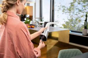 Особенностями стеклоочистителя WV 4-4 Plus являются использование сменных аккумуляторов, обеспечивающих продолжительную непрерывную работу, наличие светодиодного индикатора состояния аккумулятора и инновационная силиконовая стяжка, с помощью которой можно очищать оконные стекла до самого нижнего края. Продуманная комбинация пульверизатора для нанесения чистящего средства, микроволоконной насадки для его распределения по стеклу и самого стеклоочистителя, оснащенного электрическим всасывающим устройством, обеспечивает сияющую чистоту стекол – на них не остается никаких полос или разводов. С помощью этого аппарата можно легко очищать и любые другие гладкие поверхности. При этом эргономичная конструкция аккумуляторного стеклоочистителя WV 4-4 Plus обеспечивает максимальную гигиеничность: опорожнение и очистка бачка для грязной воды производятся без непосредственного контакта с ней. Не входящий в комплект поставки сменный аккумулятор Kärcher Battery Power 4 В совместим со всеми аппаратами Kärcher на этой аккумуляторной платформе.